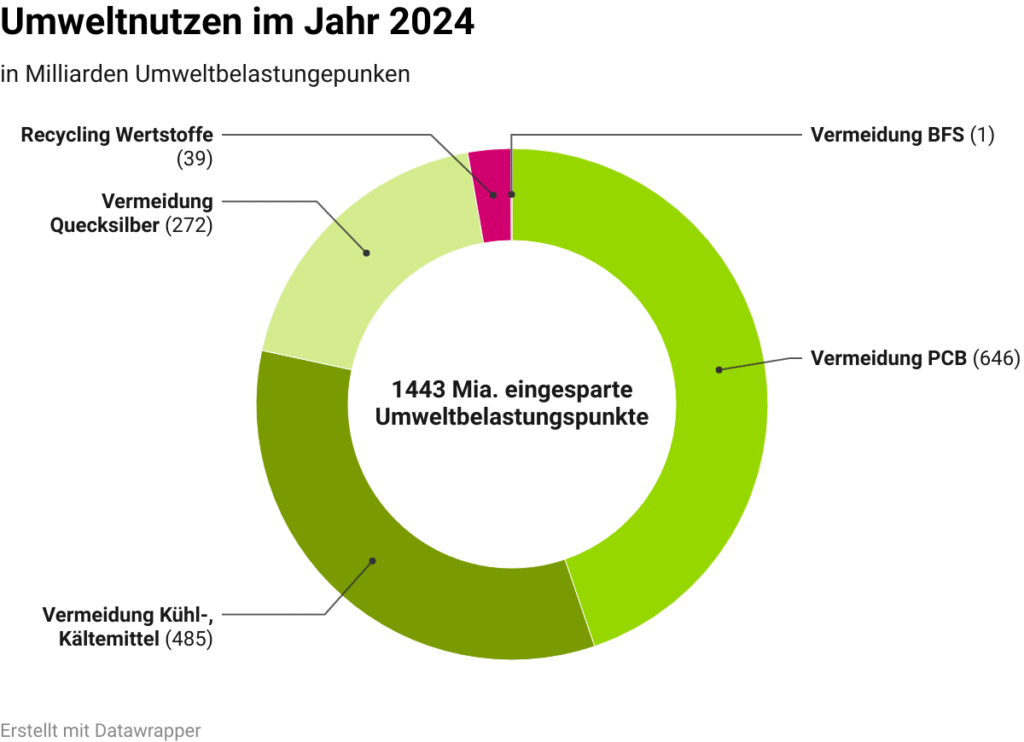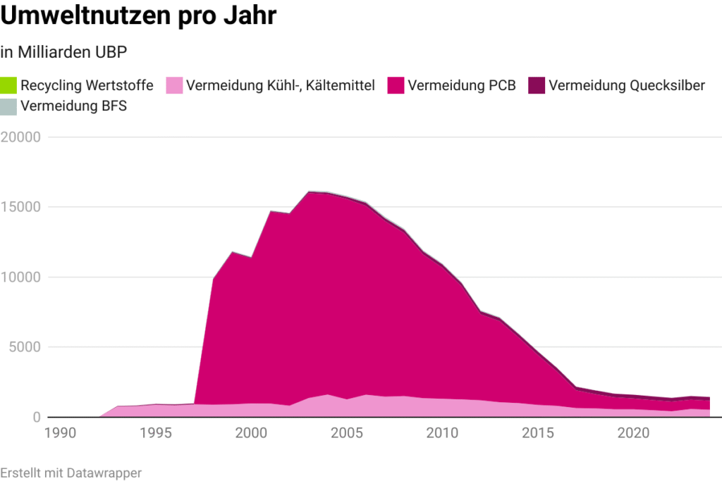 Die Schadstoffentfrachtung trägt mit insgesamt 1 404 Milliarden UBP den Hauptanteil am Gesamtumweltnutzen von SENS eRecycling. Insbesondere die fach- und umweltgerechte Verarbeitung von Polychlorierten Biphenyle (PCB), Kühl- und Kältemitteln sowie Quecksilber tragen einen entscheidenden Beitrag zur Umweltleistung des SENS-Rücknahmesystems bei. Die Aufbereitung von Wertstoffen mit 40 Milliarden UBP stellt zwar nur einen geringen Anteil, aber einen nicht unwesentlichen, am Umweltnutzen dar. «Längerfristig wird die Bedeutung der Wertstoffaufbereitung weiter zunehmen, insbesondere wenn wir es gemeinsam mit unseren Partnern aus Wirtschaft und Politik schaffen, in Zukunft weitere Rohstoffkreisläufe wie zum Beispiel jene von PV-Modulen zu schliessen», ist der Geschäftsführer von SENS eRecycling überzeugt.